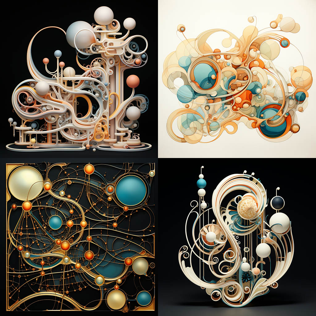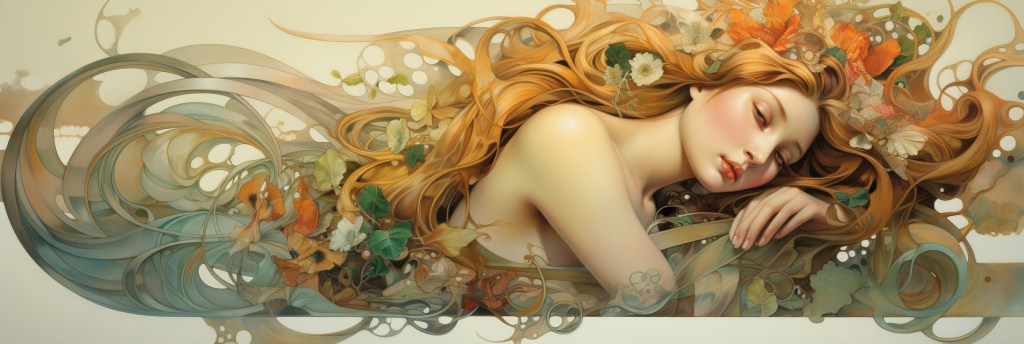 | Rhythmic, Fluid Lines | Lines that flow smoothly and with a certain rhythm, creating a harmonious visual effect typical in Art Nouveau artwork. |