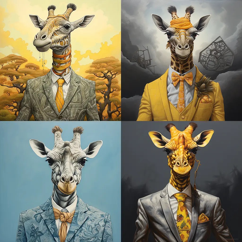 /imagine prompt: anthromorphic giraffe wearing a necktie and suit gouache:: mystical everyday, surreal blending of reality, dreamlike imagery, vivid, unexpected contrasts, intricate detailing, realistic textures, enchanting ambiguity, fantastical ordinary, cultural synthesis:: --chaos 20 --stylize 125