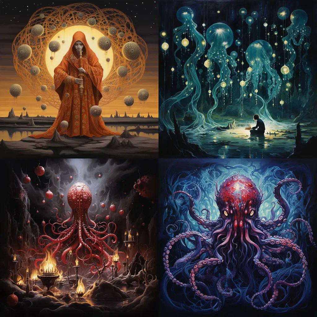 /imagine prompt: the octopus oracle is a fount of wisdom gouache:: mystical everyday, surreal blending of reality, dreamlike imagery, vivid, unexpected contrasts, intricate detailing, realistic textures, enchanting ambiguity, fantastical ordinary, cultural synthesis:: --chaos 20 --stylize 125