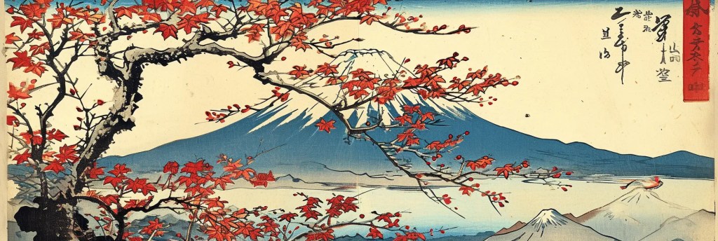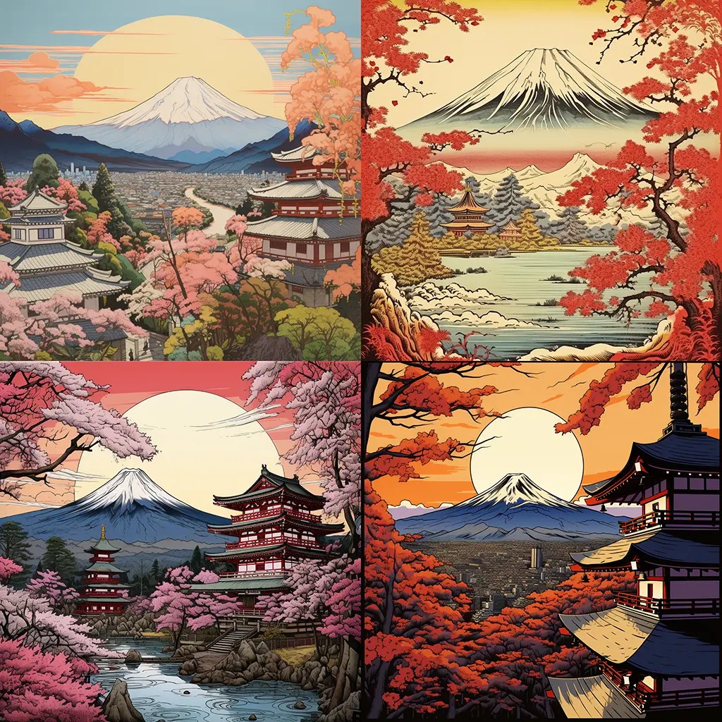 /imagine prompt: Mount Fuji:: woodblock print, vibrant color palette, dynamic composition, detailed landscapes, strong linework, expressive, traditional Japanese scenery::0.5 --chaos 20 --stylize 125 --v 5.2 --no wave
