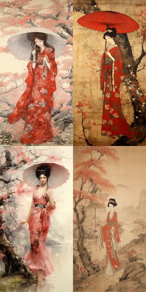 In this deconstruction section, we’ll delve into the quintessence of Ukiyo-e’s style, a style characterized by its vivid storytelling, elegant simplicity, and profound connection to nature and everyday life. We will explore how these artworks encapsulate an era through their unique visual language, blending bold lines, flat coloration, and poetic imagery.