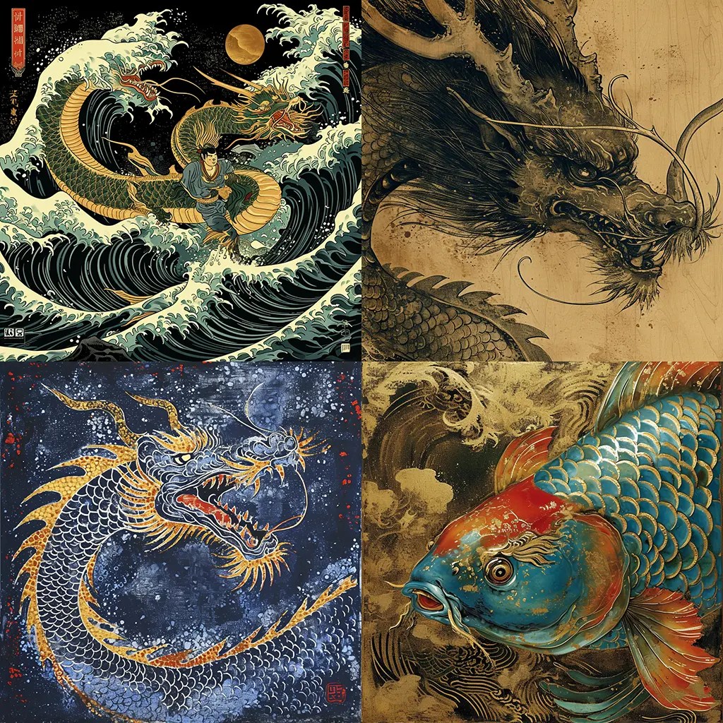 /imagine prompt: naga with glittering scales japanese mythology:: woodblock print, ink modulation, gold leaf, prussian blue, expressive lines, detail oriented, japanese mythology::0.5 --chaos 20 --v 6.0